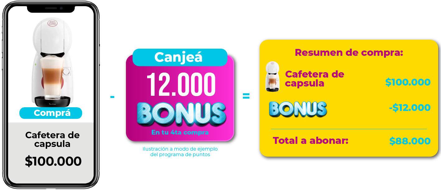 La asignación de Bonus por compras, será establecida en cada ocasión y serán publicadas en la cuenta de cada comprador con hasta 72 hs. hábiles después de realizada la compra, dichos BONUS podrán ser canjeados después de la 3ra Compra. No incluye compras que se hayan utilizado bonos de descuentos u otras promociones.