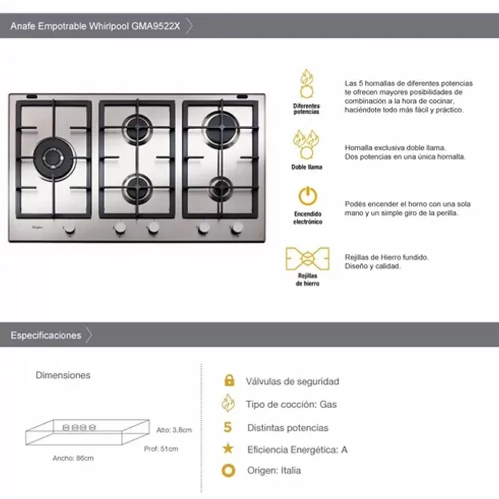 Anafe de empotrar A Gas Whirlpool Gma9522x 5 Hornallas