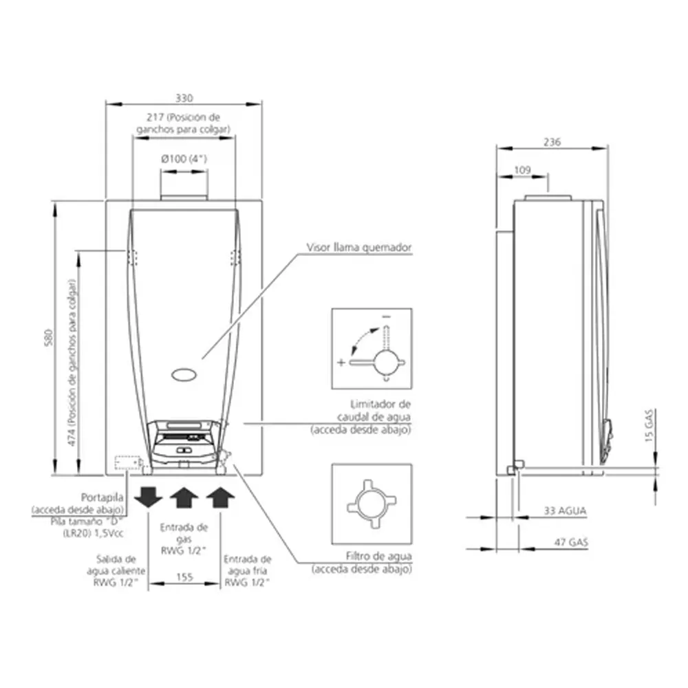 Sistema de protección de sobretemperatura. Apaga el artefacto en caso de exceso de temperatura en el circuito de agua.