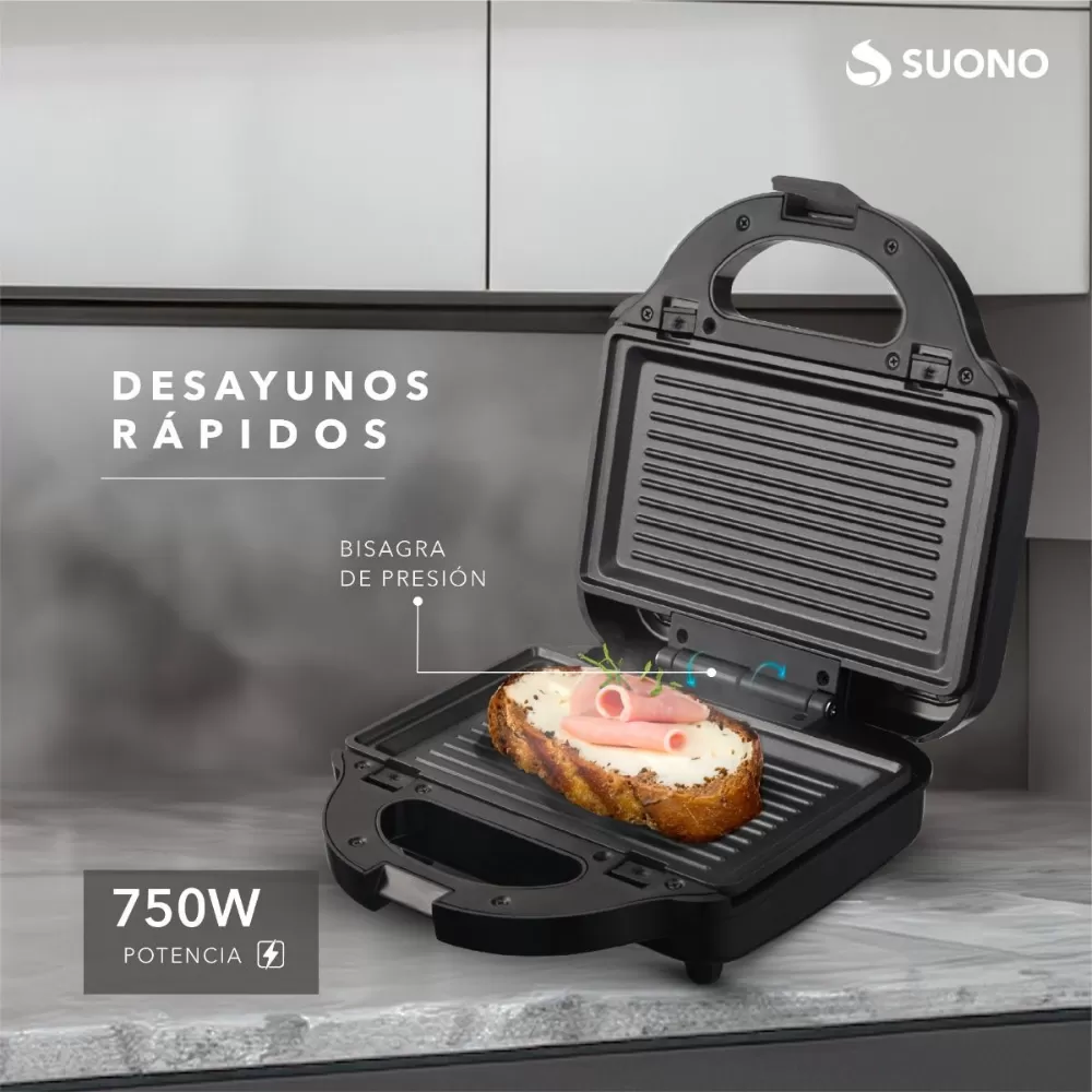 Las placas antiadherentes de la Sandwichera 3 en 1 Suono aseguran que tus creaciones no se queden pegadas, facilitando la limpieza y garantizando que tus paninis, wafles y sándwiches se deslicen sin esfuerzo.