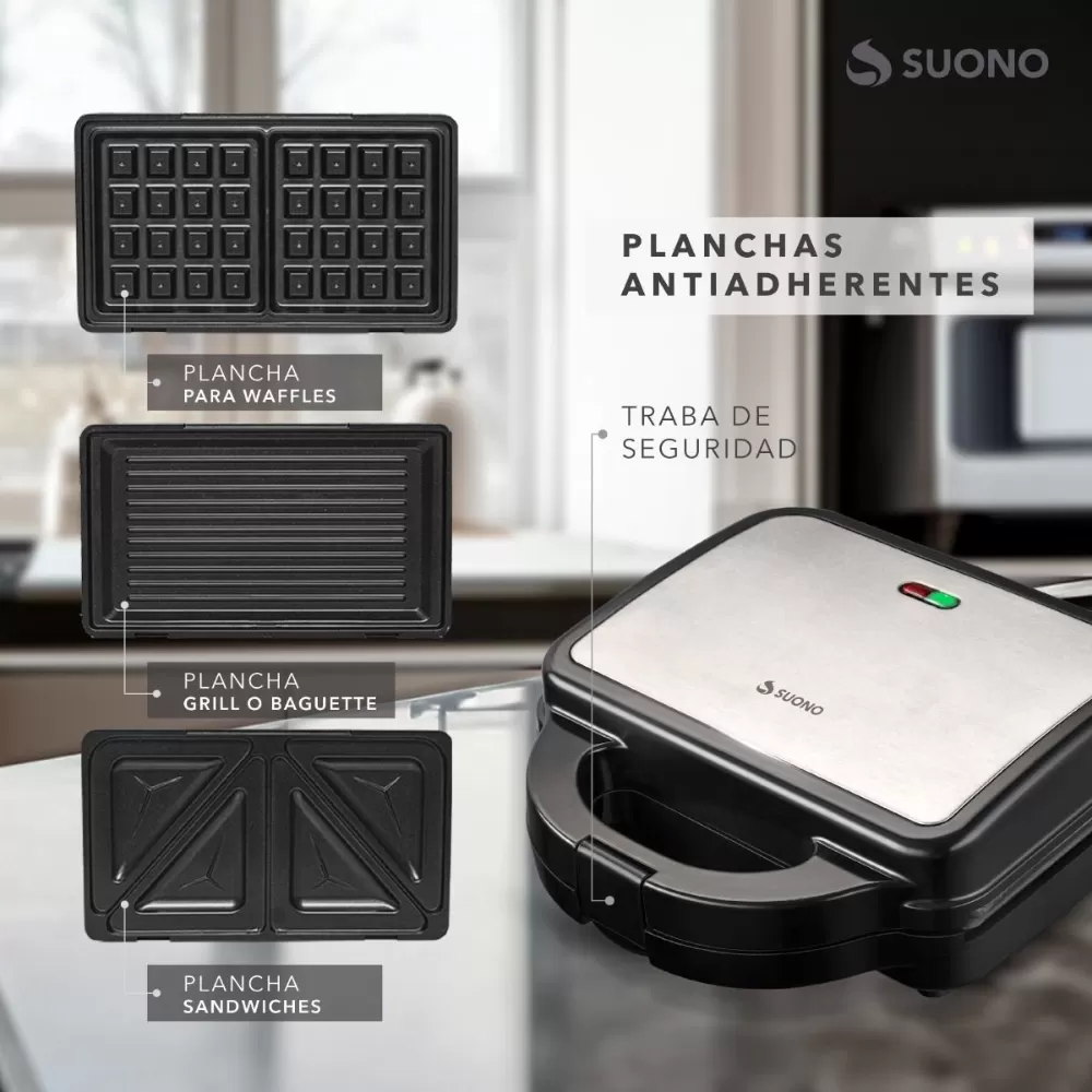 La Sandwichera 3 en 1 Suono es la solución todo en uno para satisfacer tus antojos de panini, wafles y sándwiches.