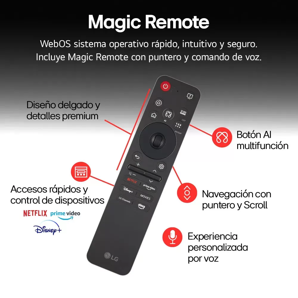 Equipado con el potente sistema operativo webOS, navegar por tus aplicaciones y contenido favorito es rápido y fácil. Disfruta de una variedad de servicios de streaming y una interfaz intuitiva que te permite acceder a lo que amas con un solo clic. Además, el televisor incluye un control remoto Magic Remote con asistente de voz integrado, lo que simplifica aún más la búsqueda de programas y el control de dispositivos relacionados.