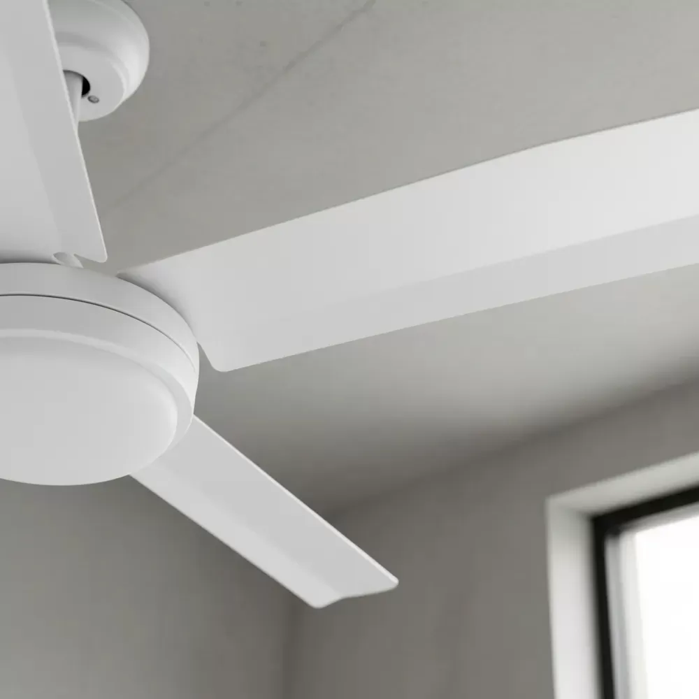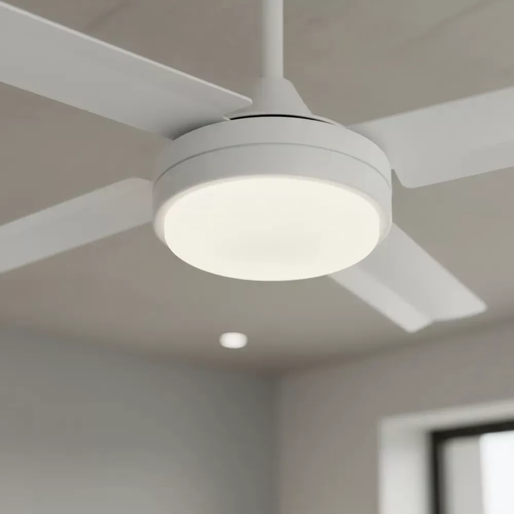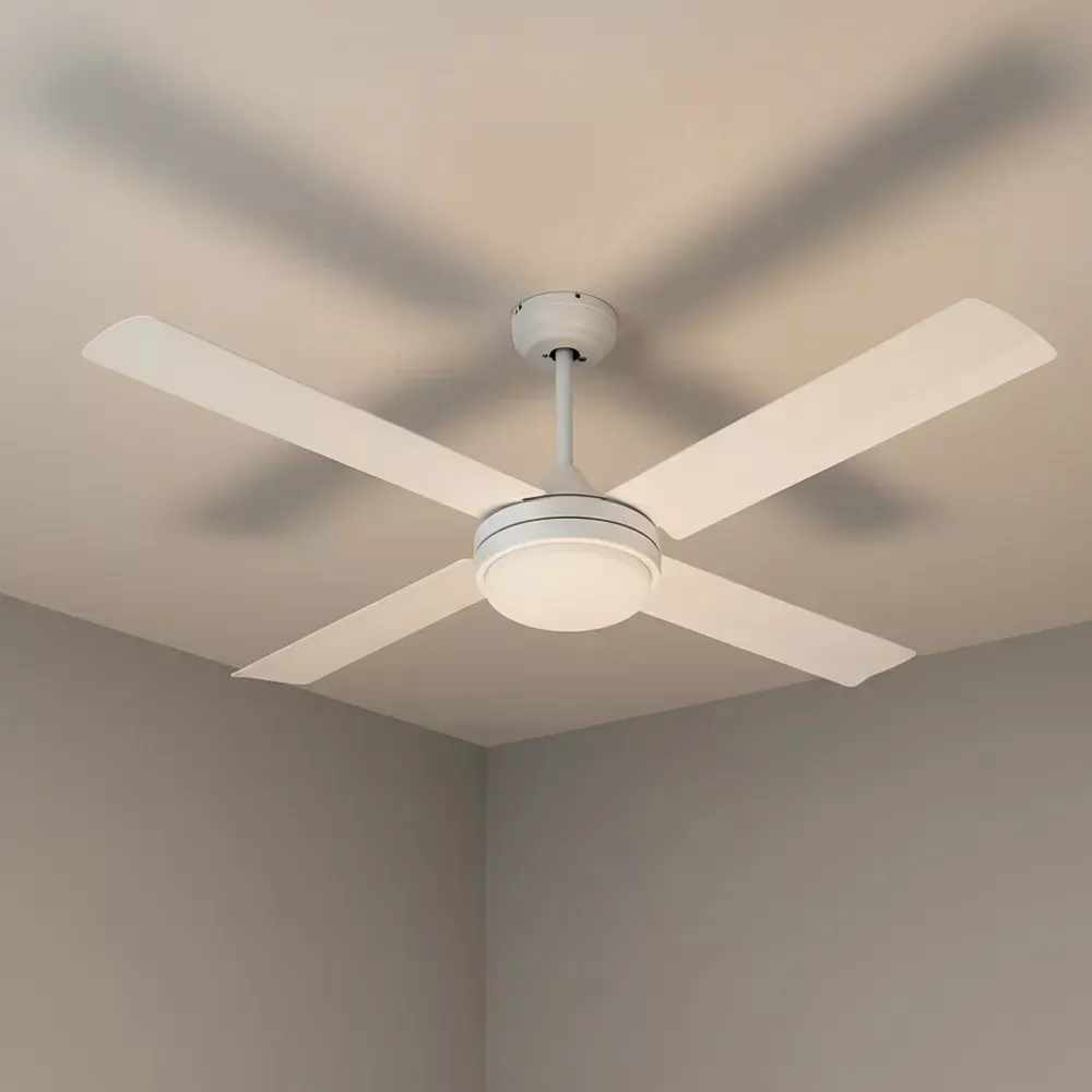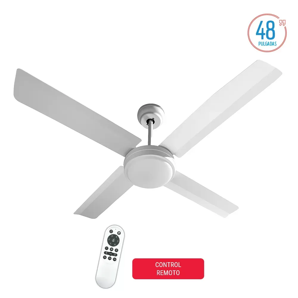 Diámetro: 1,20 m (48’’). 4 palas metálicas blancas con deflector. Luz LED 3 tonalidades (cálida / neutra / fría). Motor DC con doble rodamiento blindado. 6 velocidades. Sistema Brisa. Giro reversible. Timer programable. Control remoto. Potencia total: 85W. Motor DC: 60W. Luz LED: 25W.