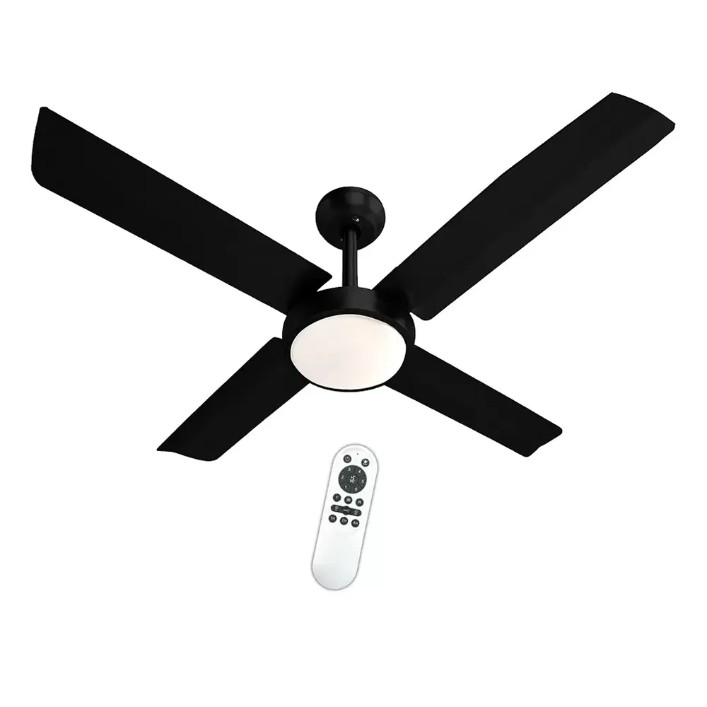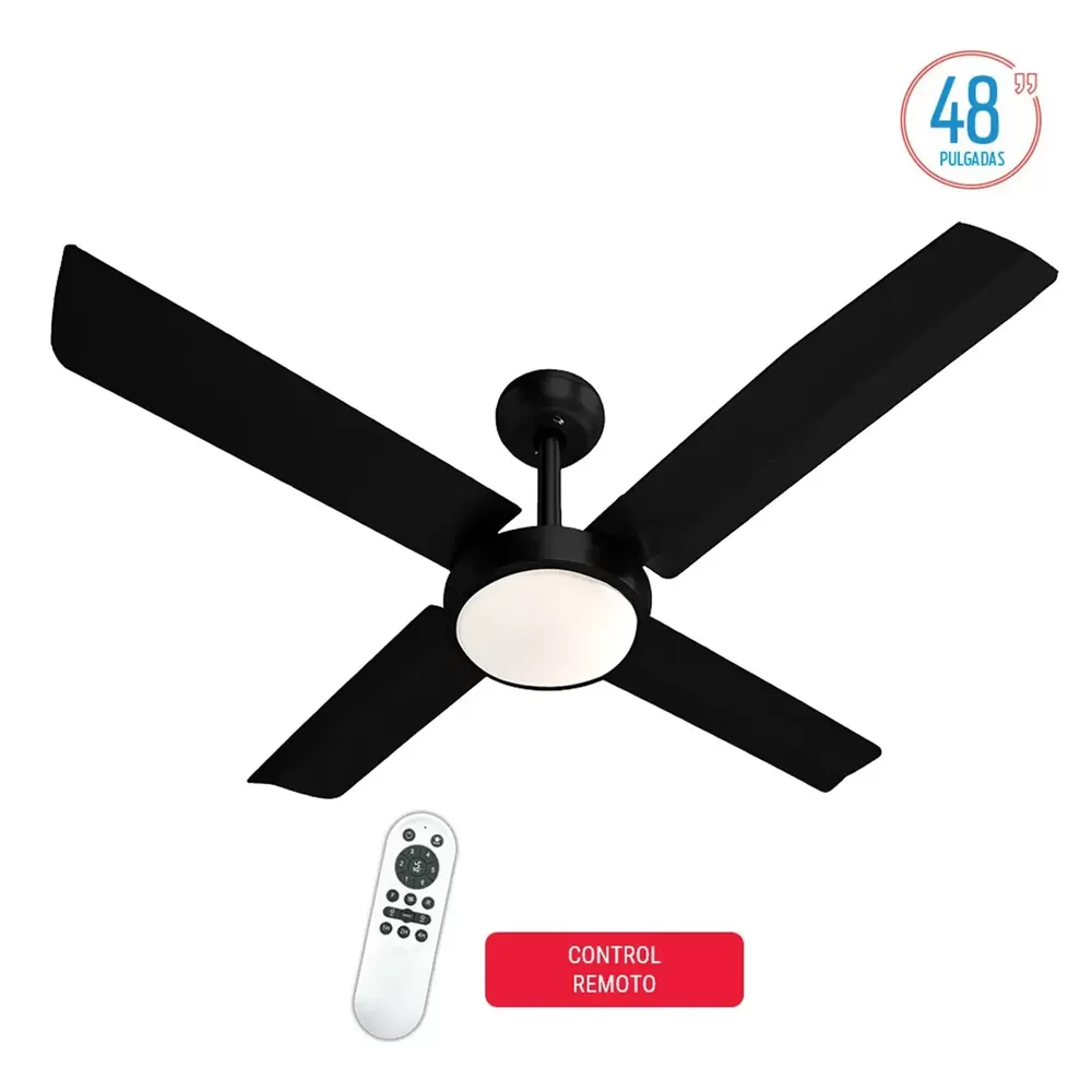 Diámetro: 1,20 m (48’’). 4 palas metálicas negras con deflector. Luz LED 3 tonalidades (cálida / neutra / fría). Motor DC con doble rodamiento blindado. 6 velocidades. Sistema Brisa. Giro reversible. Timer programable. Control remoto. Potencia total: 85W. Motor DC: 60W. Luz LED: 25W.