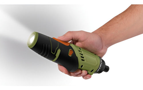 Cuenta con su fiable bateria de Ión-Litio 3.6 VCD para trabajar sin necesidad de depender de una conexión eléctrica cercana contando con un indicador led de carga y función linterna garantizando una buena visibilidad en las tareas. Cuenta además con un práctico interruptor de doble sentido para cambiar con facilidad el sentido de trabajo