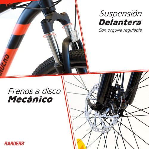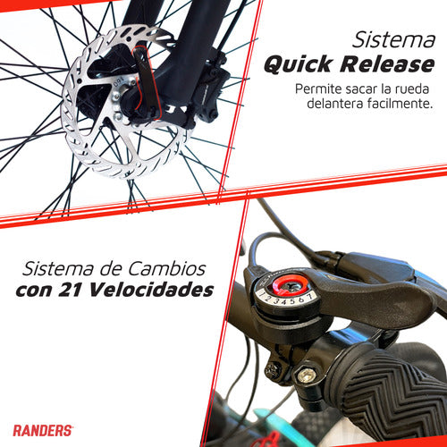 La nueva bicicleta todo terreno BKE-2129 de Randers está diseñada para acompañarte tanto por la ciudad como por distintos tipos de senderos. Cuentan con un diseño moderno, seguro y confortable. Con cuadro y horquilla de aluminio, 21 velocidades, sistema cambios Shimano, freno a disco mecánico, suspensión delantera y llantas de aluminio de doble pared. Se entrega semiarmada y calibrada de fabrica, se recomienda llevar a una bicicleteria para el ajuste final.