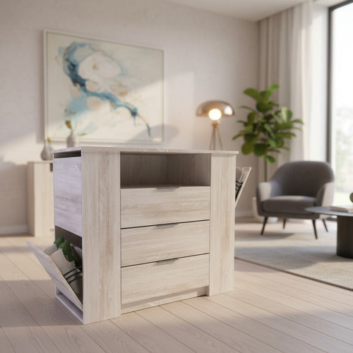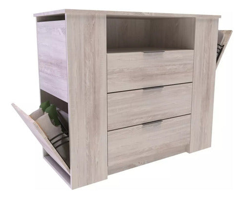 Esta cómoda cuenta con 3 cajones con correderas metálicas, que proporcionan un espacio de almacenamiento seguro y fácil de acceder. Además, incluye 4 zapateros laterales, ideales para organizar tus calzados de manera eficiente.