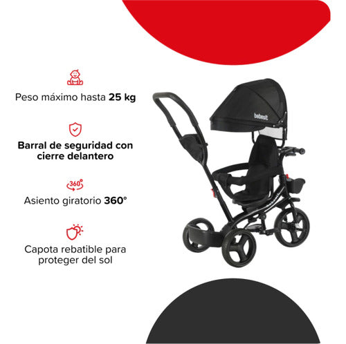 El Triciclo Bebesit Joy 3 está pensado para acompañar a tu bebé en sus primeras aventuras. Con un asiento giratorio 360°, manija direccional, estructura reforzada y capota para proteger del sol, este modelo combina seguridad, confort y estilo.
