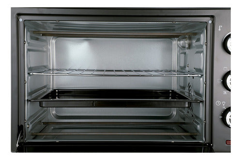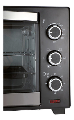Cuenta con luz interior para que puedas supervisar tus preparaciones sin necesidad de abrir la puerta, y un regulador de temperatura que va desde los 100°C hasta los 250°C, permitiéndote ajustar el calor ideal para cada receta. Además, su temporizador de hasta 60 minutos te ayuda a controlar los tiempos de cocción con precisión.