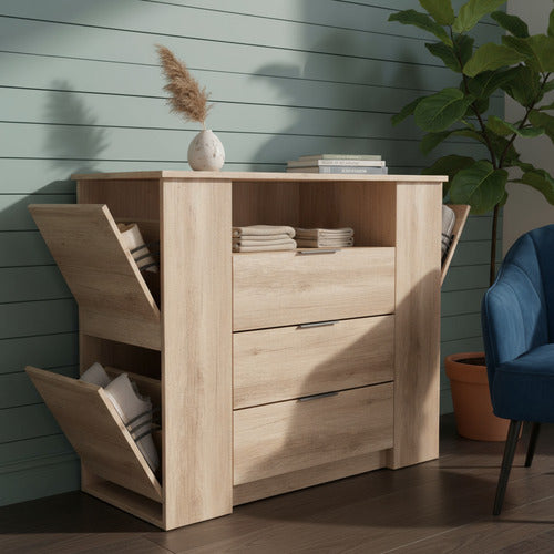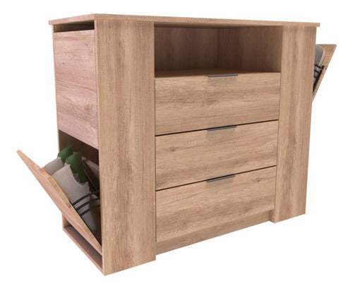 La Cómoda Zapatera Doble Delos DLD04RNN en color Roble Nebraska Natural es una solución de almacenamiento perfecta para tus calzados. Este mueble cuenta con 3 cajones con correderas metálicas y 4 zapateros laterales que te permiten tener todos tus zapatos ordenados y a mano.