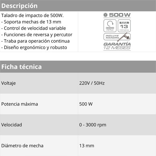 Su mandril de 13 mm te permitirá manipular fácilmente la herramienta de manera segura y precisa. Además, su velocidad variable ofrece una gran experiencia de uso, adaptada a tus necesidades y requerimentos.