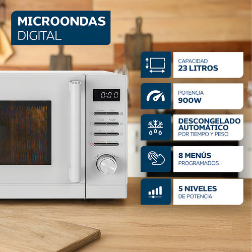 ¡Transformá tus momentos en la cocina con el Microondas Philco Digital Blanco de 23 litros! Con su diseño moderno y compacto, este microondas se adapta a cualquier espacio, ofreciéndote la comodidad que necesitás. Su potencia de 900W asegura que tus comidas estén listas en un abrir y cerrar de ojos, ideal para vos que vivís a mil por hora.