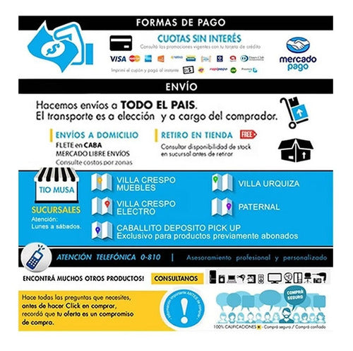 • Villa Crespo Muebles: Lunes a Sábado 10 a 13hs / 14 a 19hs.