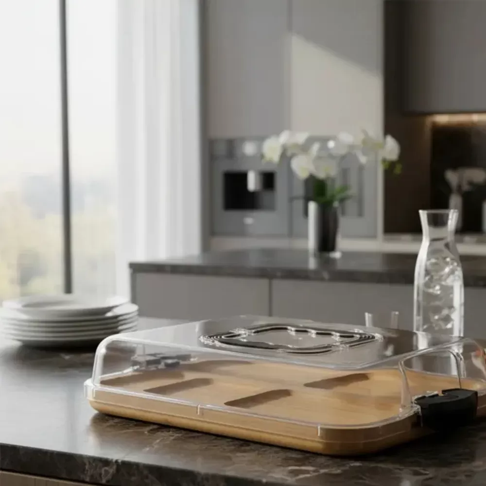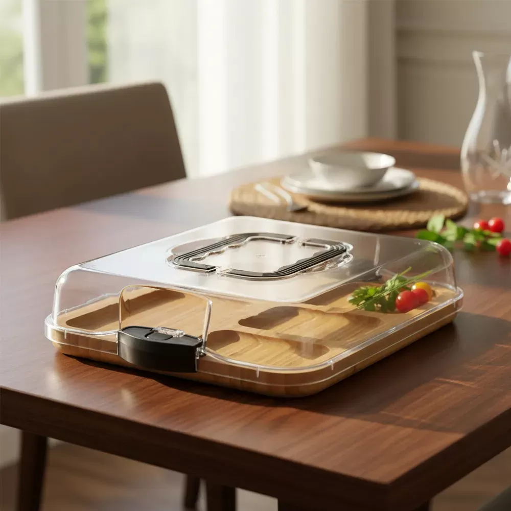 La bandeja de bambú con tapa acrílica es la opción ideal para quienes buscan elegancia y funcionalidad en sus reuniones.