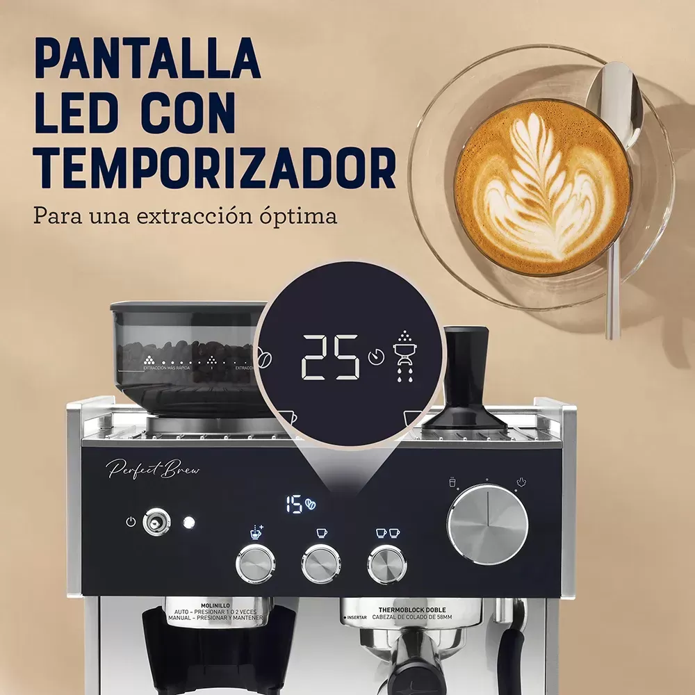 Portafiltro comercial de 58 mm para una mejor extracción y un sabor más intenso pantalla LED con temporizador para una extracción óptima.