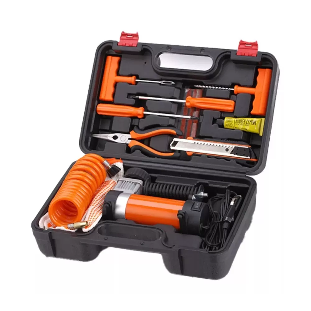 Nuestro compresor de 12v DW55-P es un equipo de inflado versátil que incluye un completo set de herramientas y accesorios para reparar pinchazos, lo que lo convierte en el compañero ideal para llevar en tu automóvil o motocicleta. Con este equipo, podrás reparar fácilmente un pinchazo y continuar con tu viaje sin contratiempos. Es compatible con una amplia variedad de vehículos y cuenta con un cable de 3 metros que te permite llegar a todas las ruedas sin problemas.