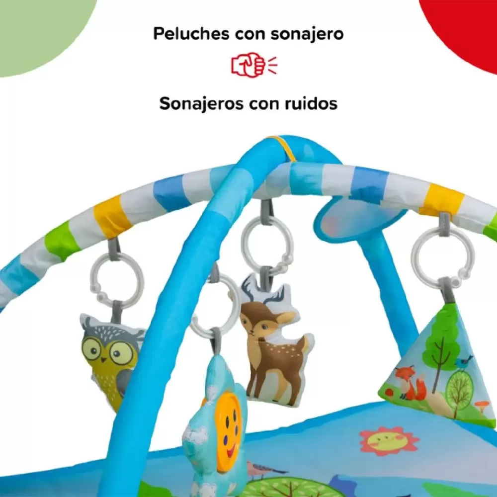 El Gimnasio de Actividades Bebesit 5010 Animales Celeste lleva a tu bebé a un bosque encantado lleno de ciervos curiosos, búhos atentos y zorros juguetones. Su tapete acolchado con ilustraciones naturales, los arcos en tonos celestes y los juguetes colgantes interactivos despiertan los sentidos y la curiosidad del pequeño mientras se divierte de forma cómoda y segura.