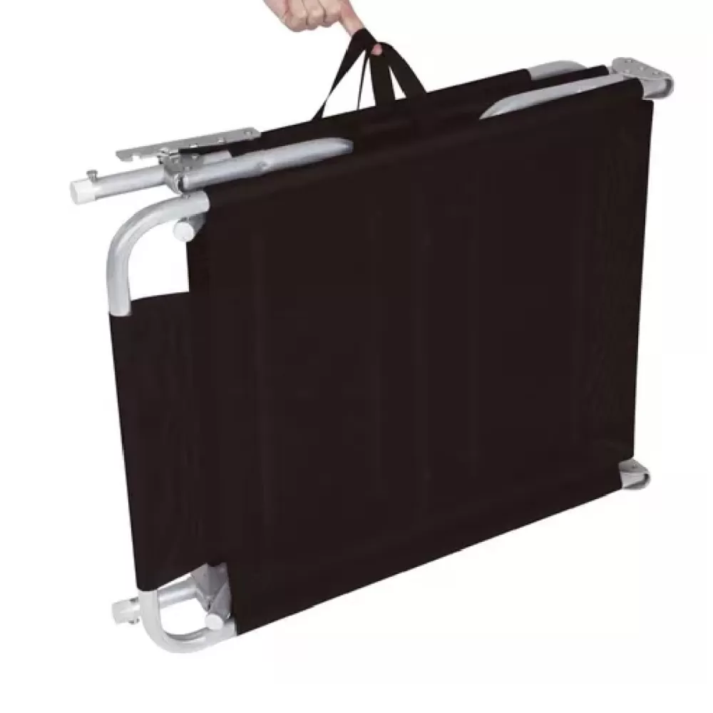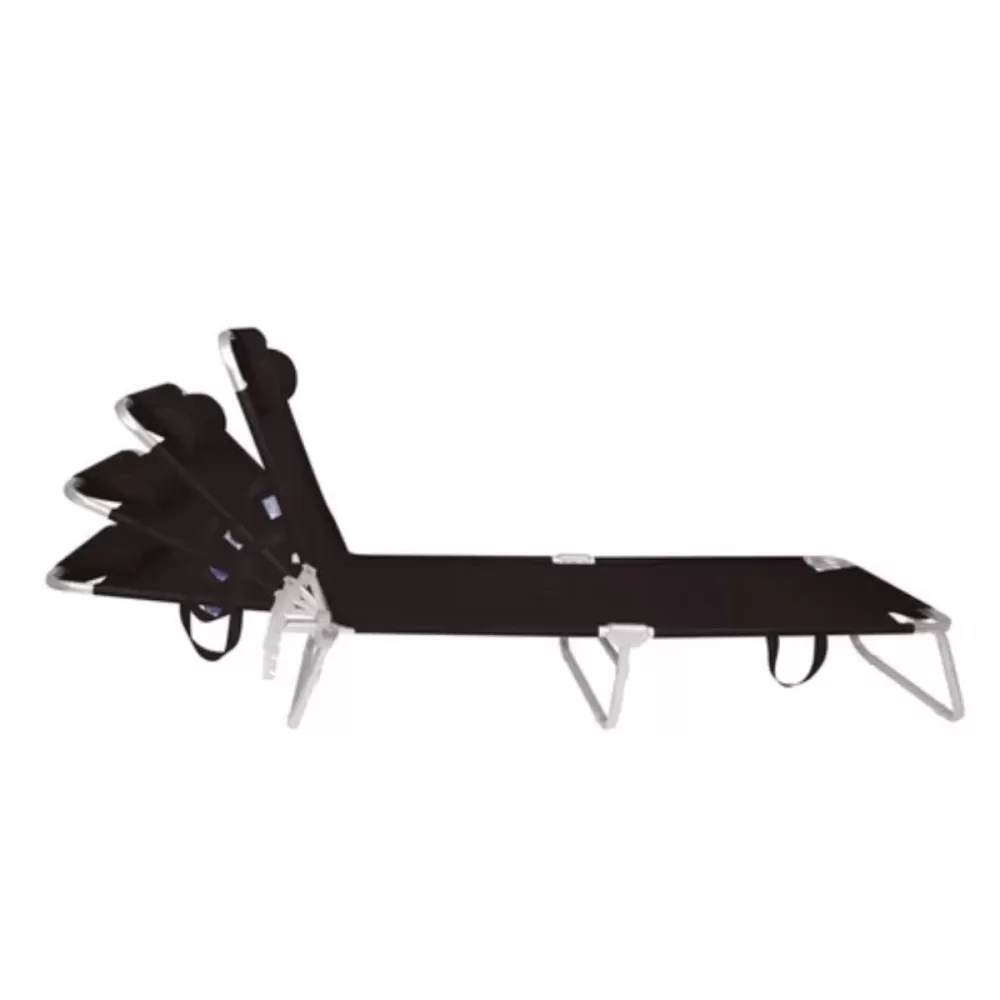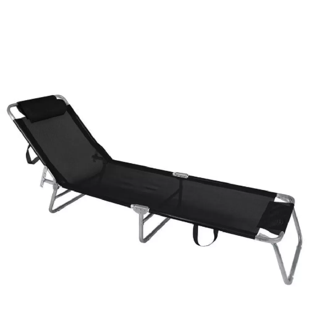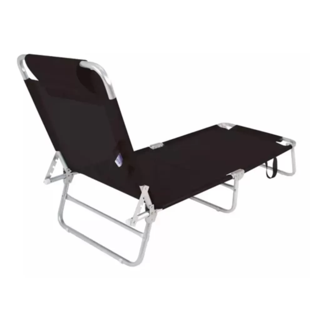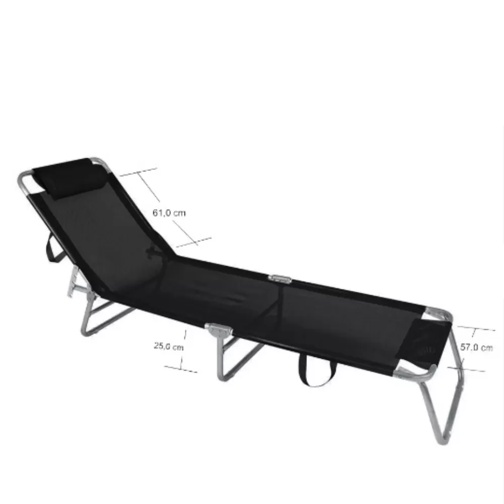 Tumbona reclinable en 4 posiciones de altura del respaldo, estructura rectangular de aluminio y tela de PVC con poliéster. Con asa de transporte, es una tumbona sumamente ligera, cómoda y práctica.