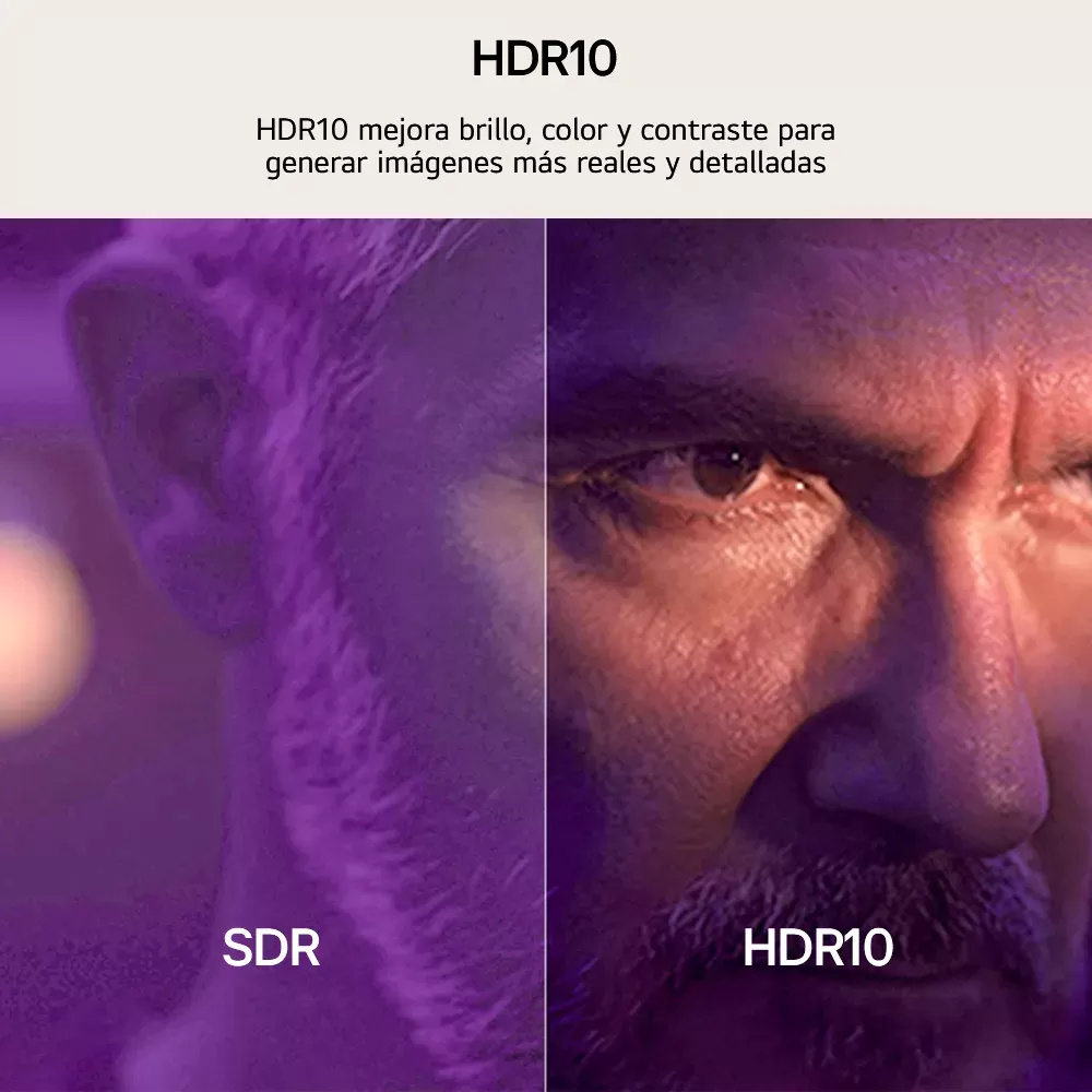 HDR10 mejora la calidad de la imagen al optimizar el brillo, el contraste y los colores con metadata estática. Esta tecnología garantiza imágenes más vibrantes, detalladas y realistas, con colores más precisos y un rango dinámico superior, ofreciendo una experiencia visual envolvente y de alta calidad.