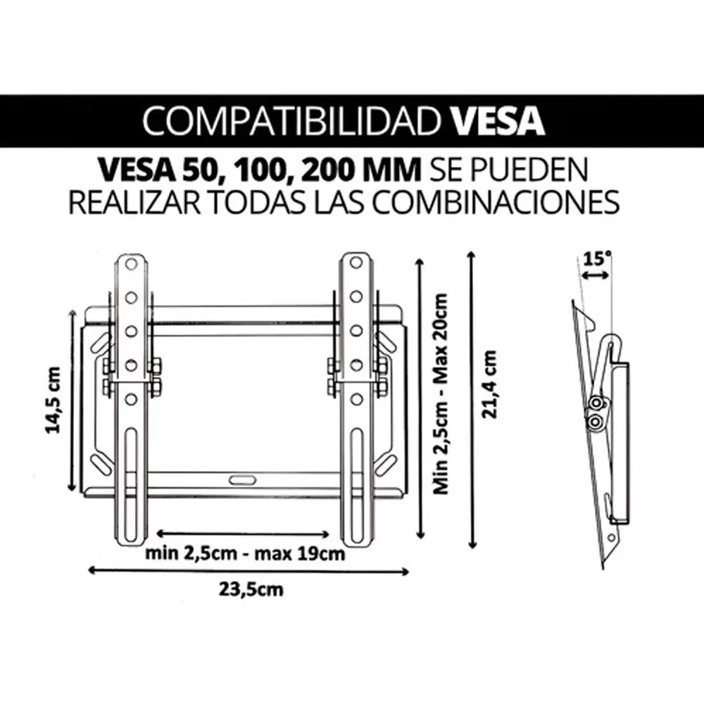 El soporte cumple con estándares VESA de 200x200, lo que asegura su compatibilidad con una amplia variedad de modelos de televisores. Con su robustez, es un producto que combina funcionalidad y estilo para el público que desea maximizar su experiencia audiovisual sin complicaciones.