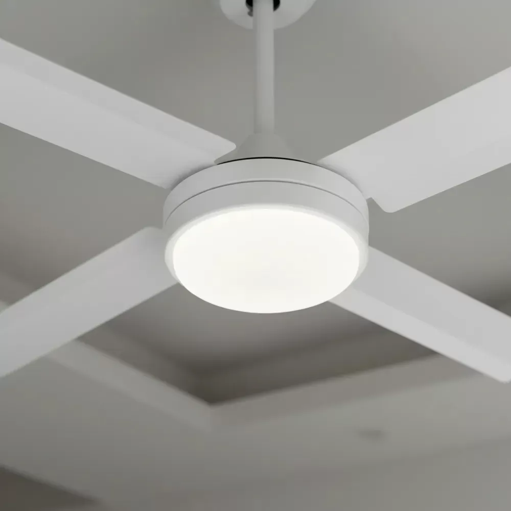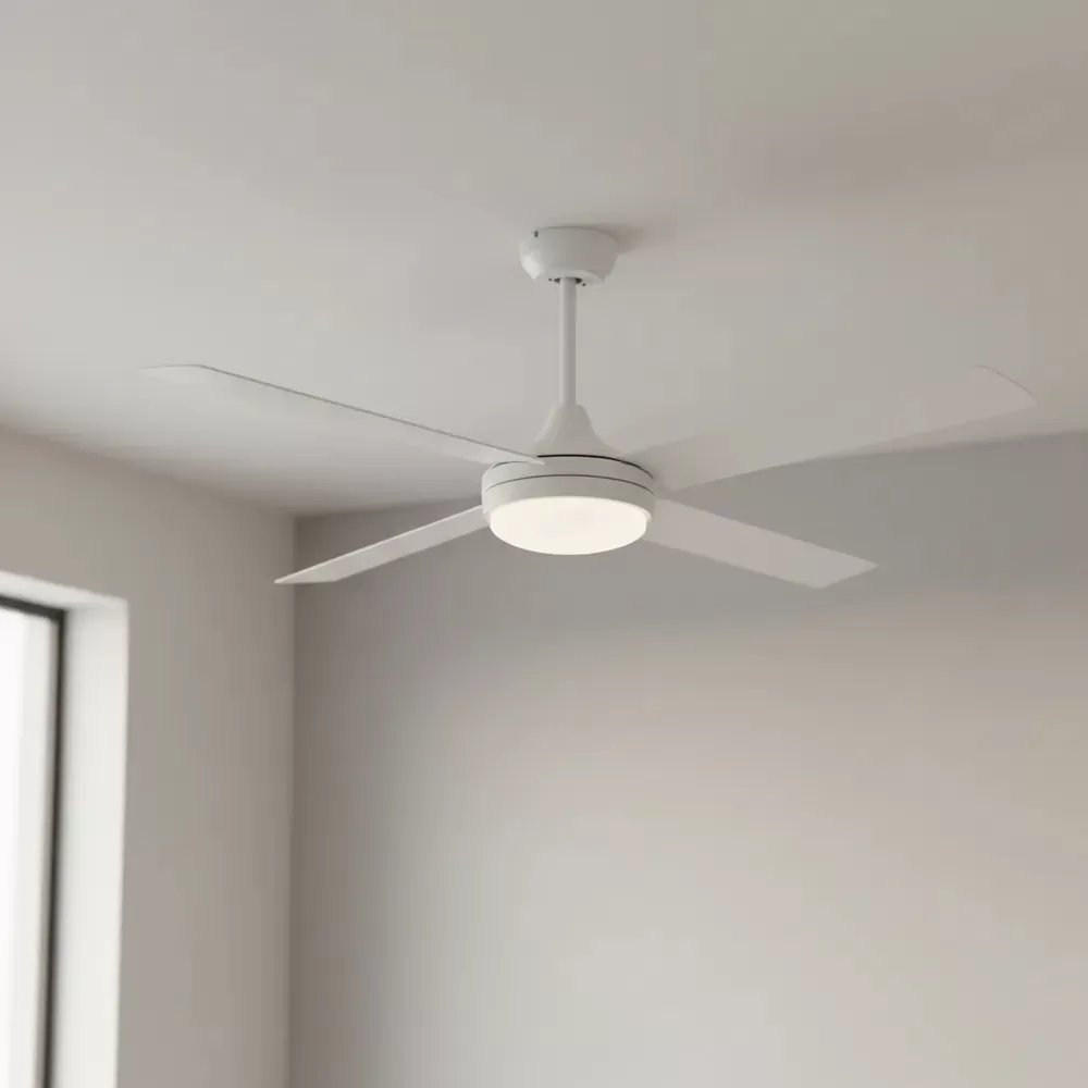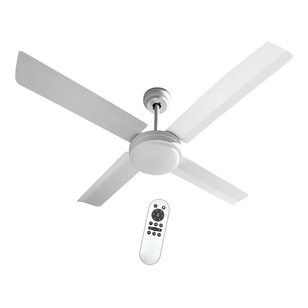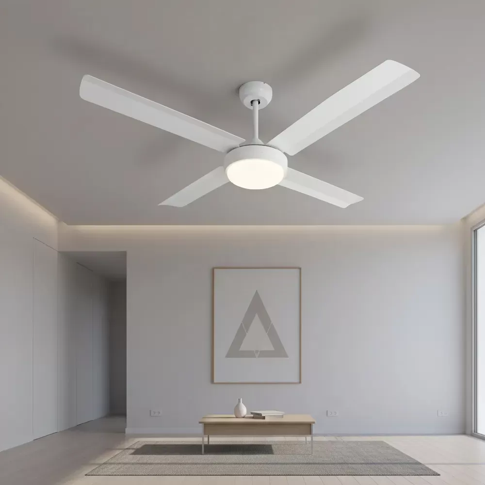 Diámetro: 1,20 m (48’’). 4 palas metálicas blancas con deflector. Luz LED 3 tonalidades (cálida / neutra / fría). Motor DC con doble rodamiento blindado. 6 velocidades. Sistema Brisa. Giro reversible. Timer programable. Control remoto. Potencia total: 85W. Motor DC: 60W. Luz LED: 25W.