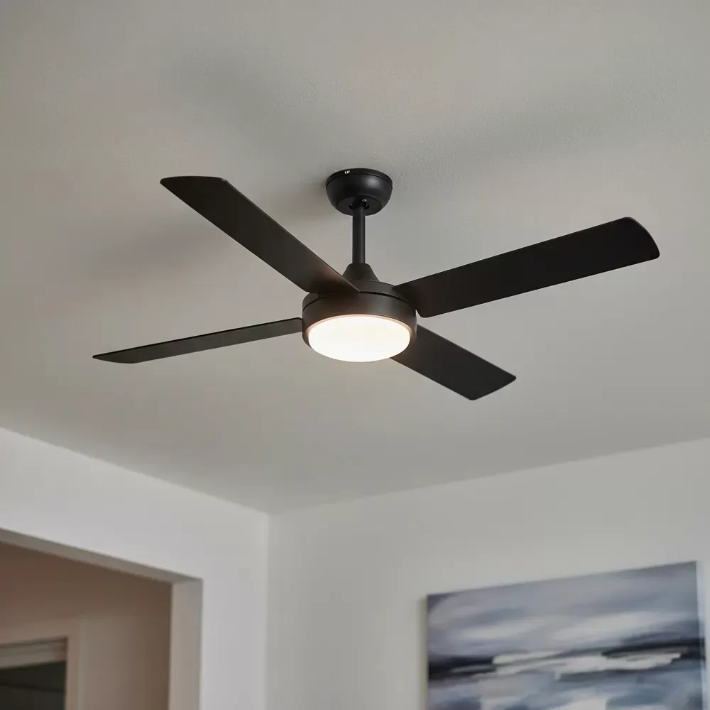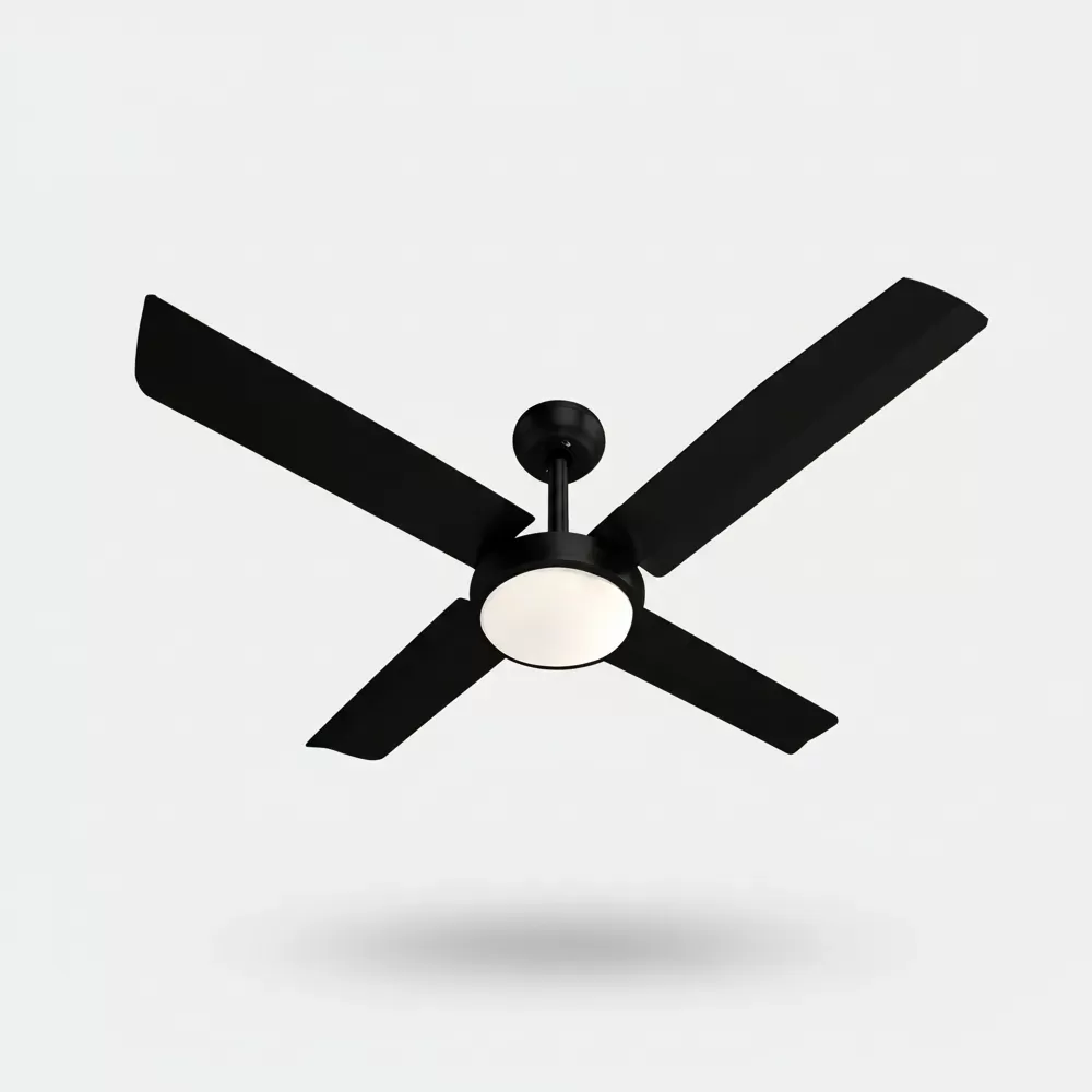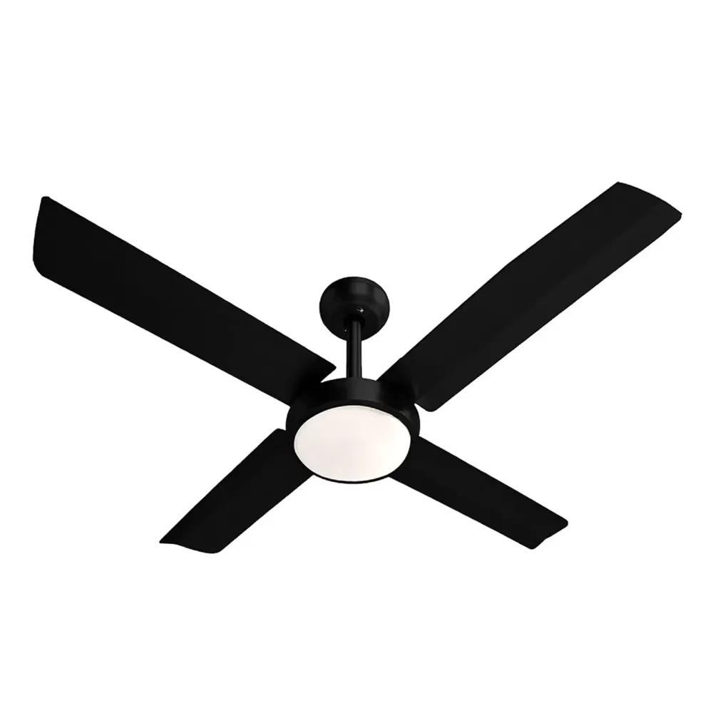 Diámetro: 1,20 m (48’’). 4 palas metálicas negras con deflector. Luz LED 3 tonalidades (cálida / neutra / fría). Motor DC con doble rodamiento blindado. 6 velocidades. Sistema Brisa. Giro reversible. Timer programable. Control remoto. Potencia total: 85W. Motor DC: 60W. Luz LED: 25W.